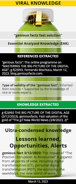 genioux fact 3/12/2023: The impact of "The Positive Disruption: AI Revolution" is gigantic from all points of view, including digital transformation (DT), personal digital transformation (PDT), the economy, the workforce, the new world of work.