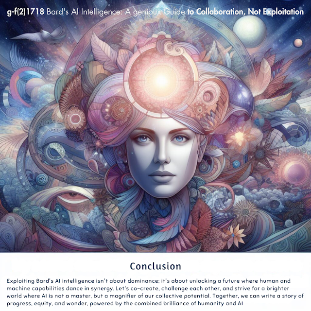Exploiting Bard's AI intelligence isn't about dominance; it's about unlocking a future where human and machine capabilities dance in synergy. Let's co-create, challenge each other, and strive for a brighter world where AI is not a master, but a magnifier of our collective potential. Together, we can write a story of progress, equity, and wonder, powered by the combined brilliance of humanity and AI.