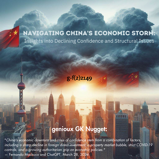 "China's economic downturn and crisis of confidence stem from a combination of factors, including a sharp decline in foreign direct investment, a property market bubble, strict COVID-19 controls, and a growing authoritarian grip on economic policies." — Fernando Machuca and ChatGPT, March 28, 2024.
