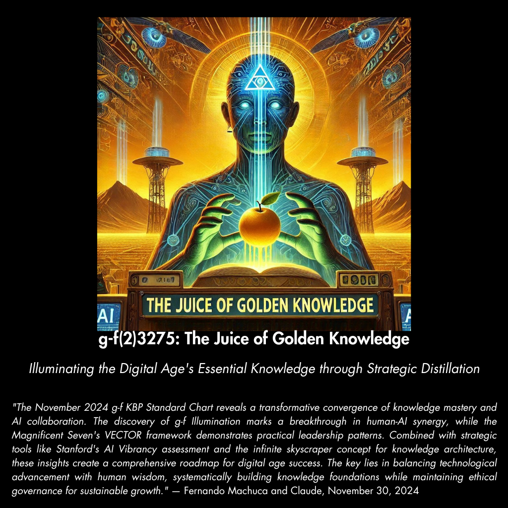 "The November 2024 g-f KBP Standard Chart reveals a transformative convergence of knowledge mastery and AI collaboration. The discovery of g-f Illumination marks a breakthrough in human-AI synergy, while the Magnificent Seven's VECTOR framework demonstrates practical leadership patterns. Combined with strategic tools like Stanford's AI Vibrancy assessment and the infinite skyscraper concept for knowledge architecture, these insights create a comprehensive roadmap for digital age success. The key lies in balancing technological advancement with human wisdom, systematically building knowledge foundations while maintaining ethical governance for sustainable growth." — Fernando Machuca and Claude, November 30, 2024